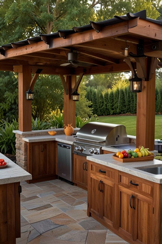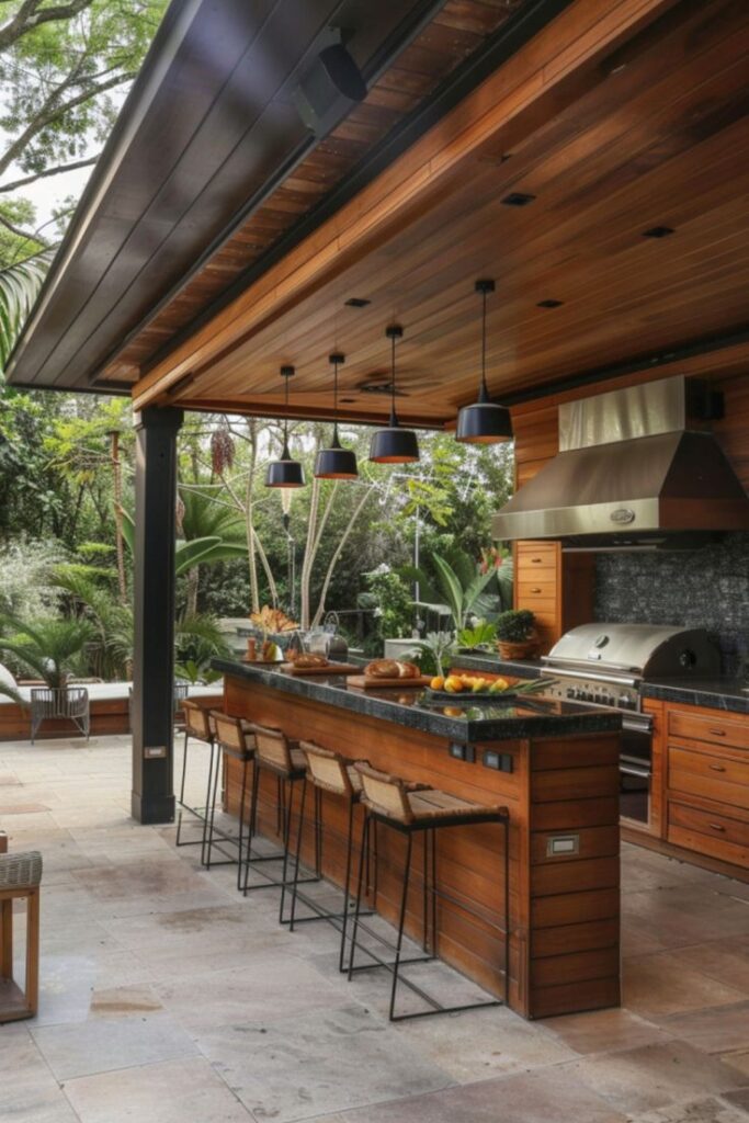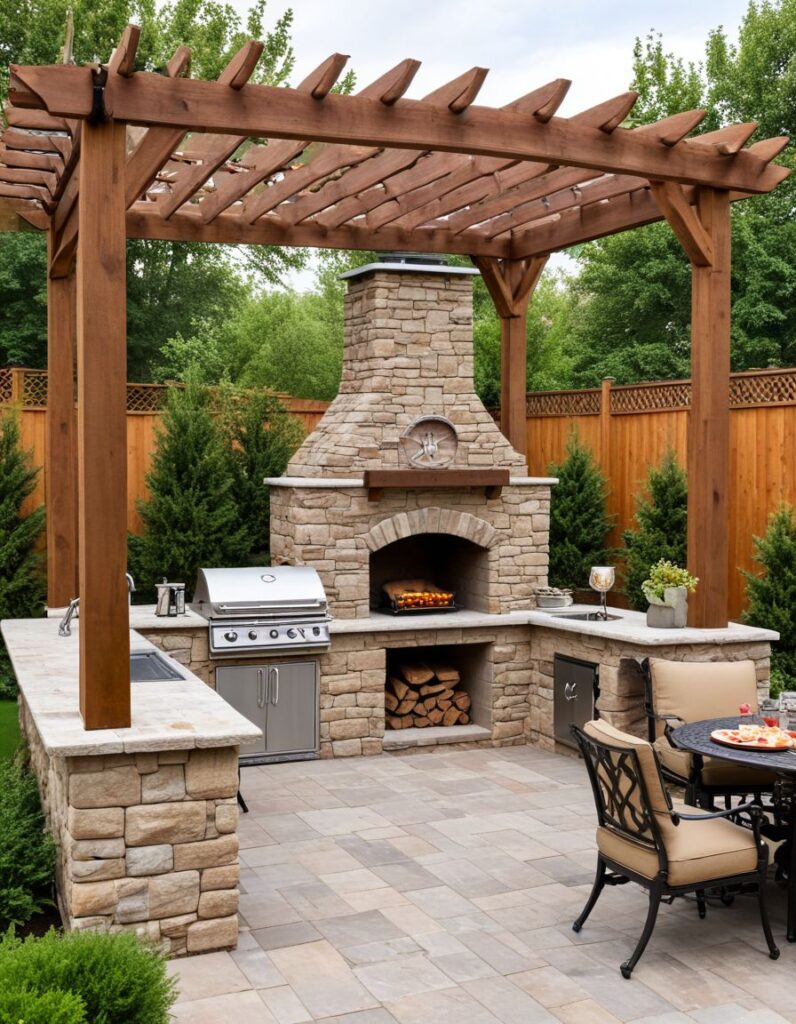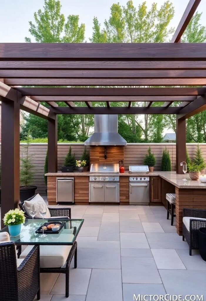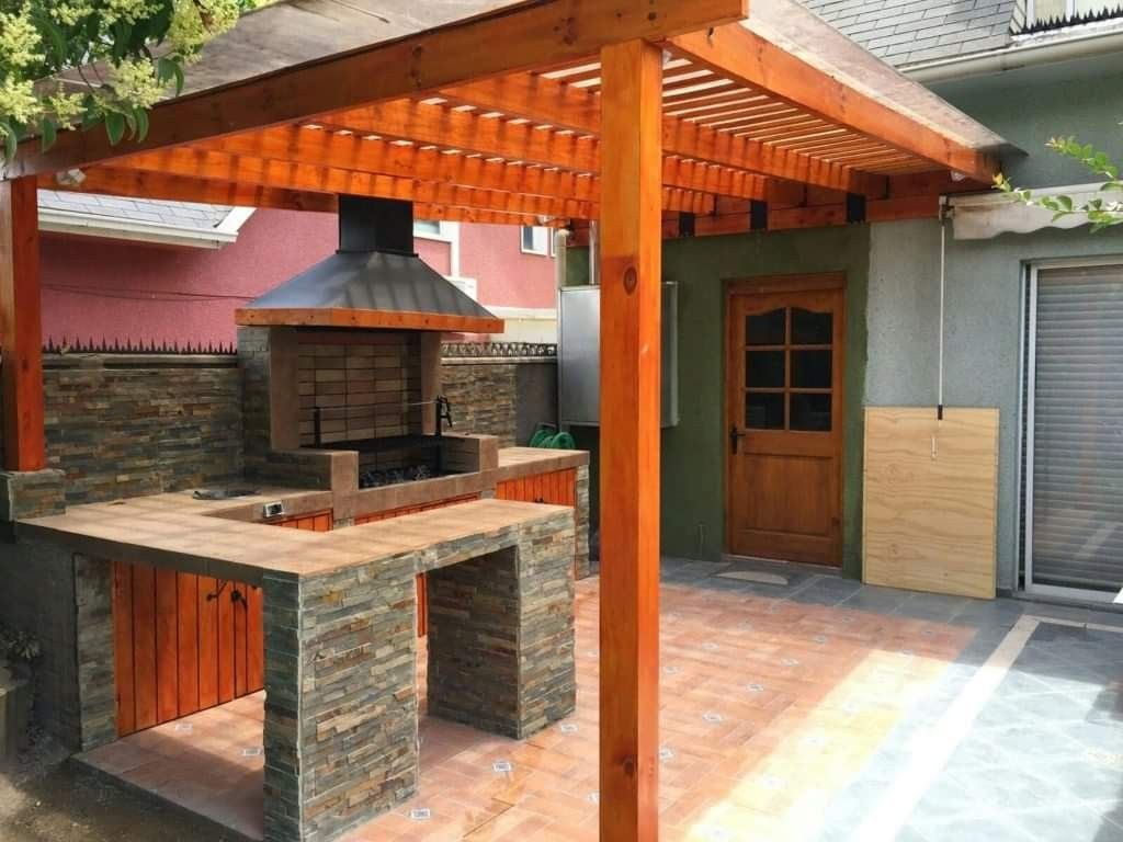 • Parrilla con pérgola de madera para un ambiente acogedor: La parrilla con pérgola de madera permite combinar funcionalidad y diseño en un solo espacio exterior. La estructura de madera proporciona sombra y crea un ambiente acogedor. Este diseño nos permite decorarlo con plantas o luces, lo que mejora la estética del patio. Además, mantiene un estilo rústico y a su vez tradicional, logrando crear un equilibrio entre comodidad, elegancia y contacto con la naturaleza en reuniones familiares o encuentros sociales al aire libre.