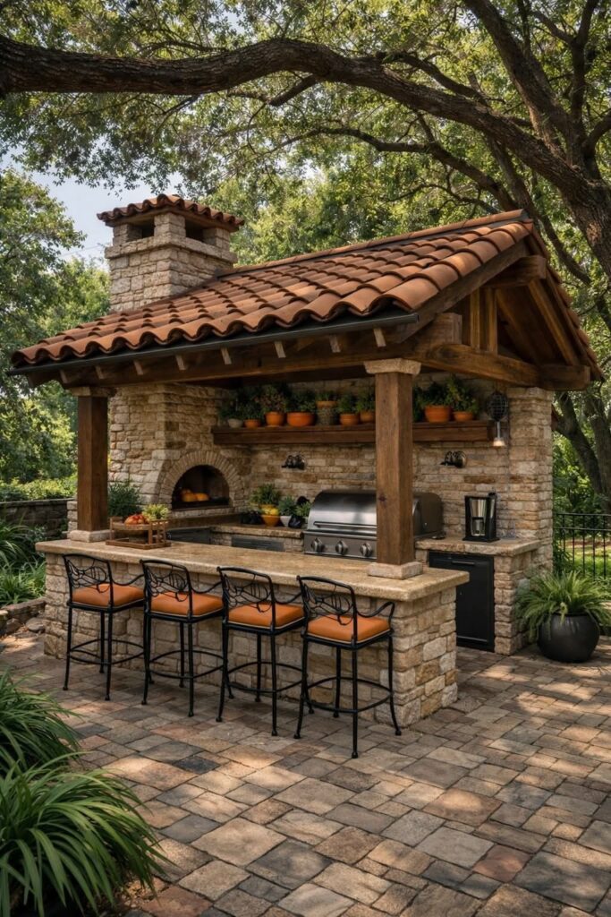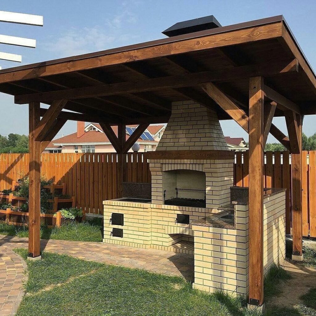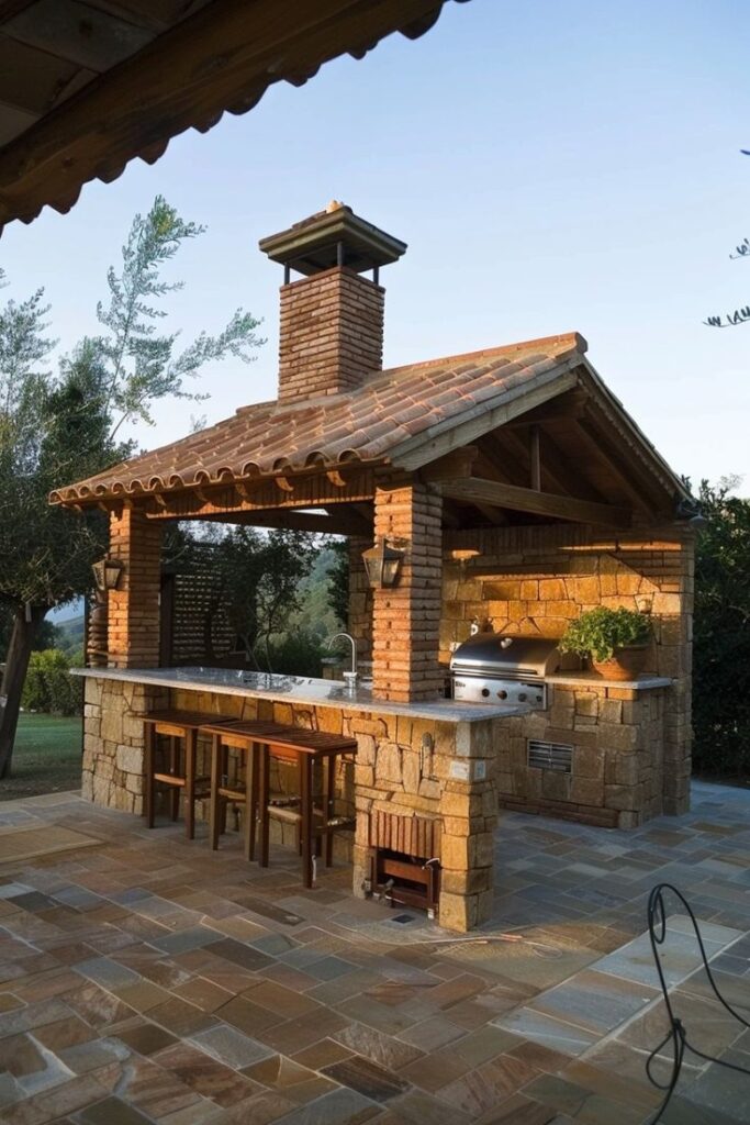 • Parrilla con techo de tejas para protección y estilo campestre: La parrilla con techo de tejas es ideal para quienes buscan protección y estilo en un solo espacio. Este diseño logra incorporar una cubierta que nos resguarda del sol y la lluvia, permitiéndonos de esta manera cocinar en cualquier momento. Las tejas aportan un aspecto campestre muy atractivo. Además, crea un espacio más cómodo y funcional, perfecto para compartir momentos agradables con familia y amigos en reuniones al aire libre.