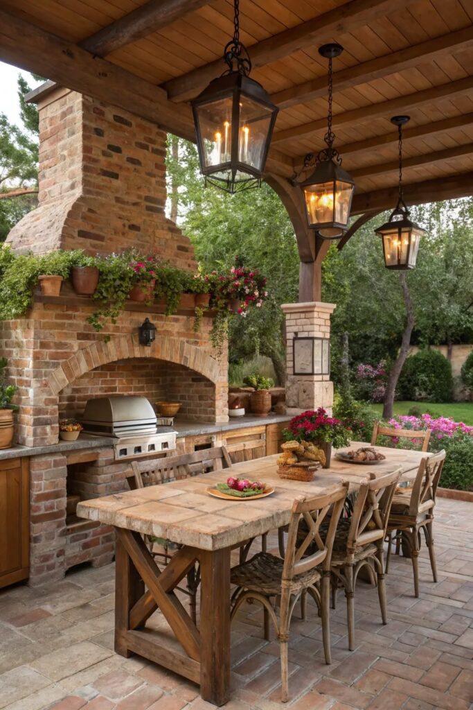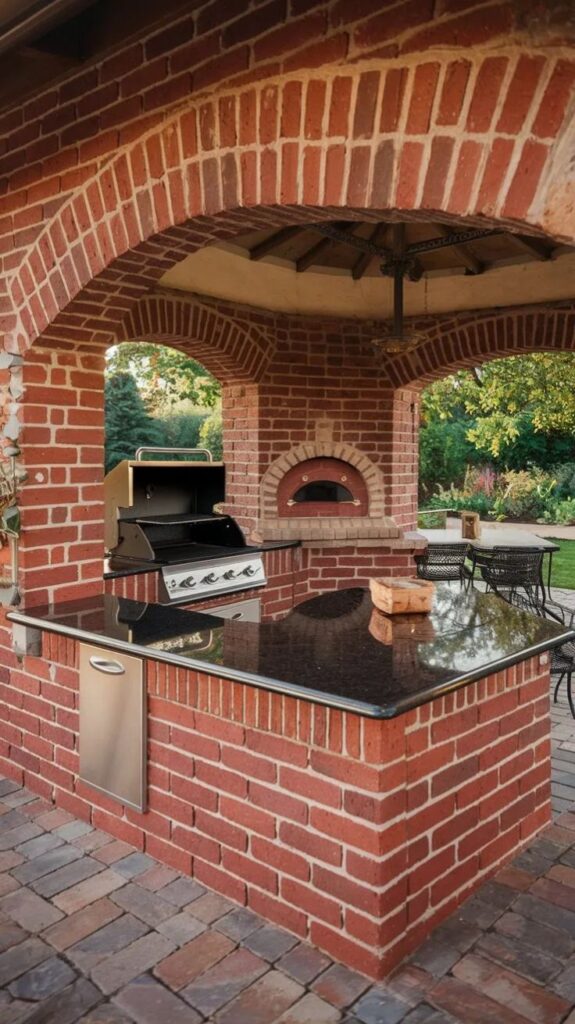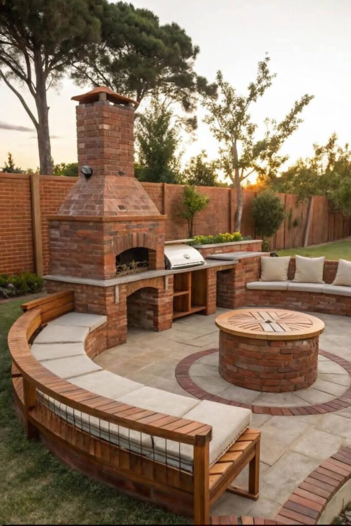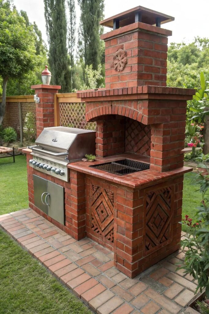 • Parrilla rústica de ladrillo clásico para patios tradicionales: La parrilla rústica de ladrillo clásico es una de las opciones más bellas y tradicionales para patios. Su construcción a base de ladrillos resistentes garantiza durabilidad frente al calor y el clima. Este diseño permite incorporar una chimenea que mejora la ventilación durante la cocción. Además, gracias a su apariencia cálida y acogedora permite combinar perfectamente con sus jardines, creando un espacio ideal para reuniones familiares y momentos agradables al aire libre.